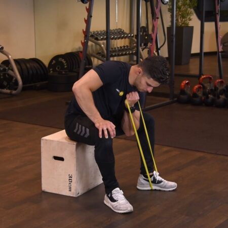 Atlas ćwiczeń > Ćwiczenia dla mężczyzn > Biceps > Uginanie ramienia z gumą mini band w oparciu o kolano